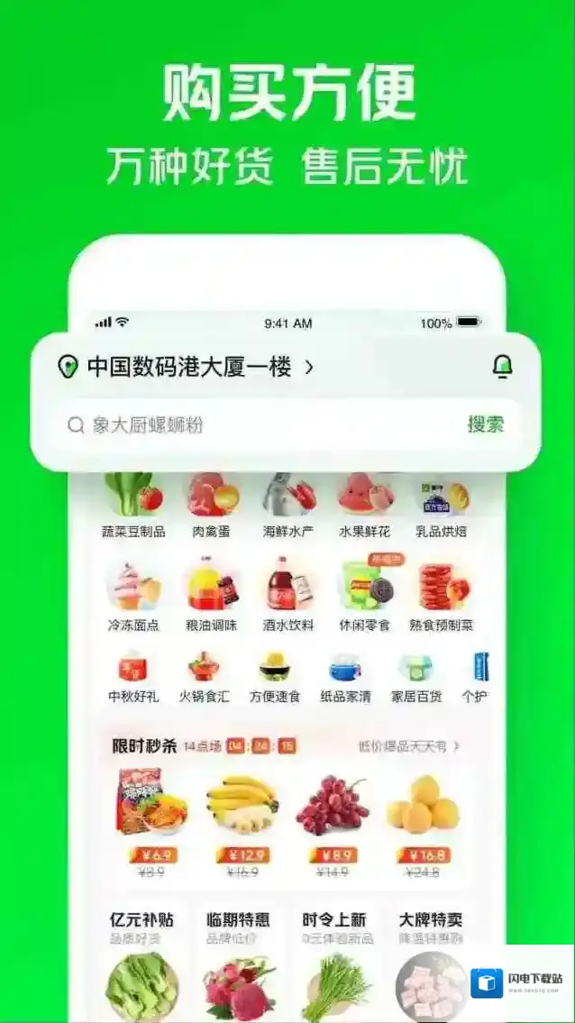 1、新鲜蔬菜、水果、肉禽蛋、米面粮油,水产海鲜、南北干货、方便速食。应有尽有,厨房用品也能买到哦。
